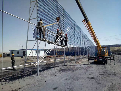 防風(fēng)抑塵網(wǎng)長度最長不得超過6.15米(網(wǎng)長越長,鋼結(jié)構(gòu)的距離越遠(yuǎn),擋風(fēng)效果越差),峰高7.5cm防風(fēng)效果最佳,此為國家科學(xué)院風(fēng)洞試驗(yàn)得出的結(jié)論,由于各地所處地理環(huán)境不同,氣象條件不同,也應(yīng)采用不同規(guī)格型號的擋風(fēng)抑塵墻才能達(dá)到有效防風(fēng)抑塵的效果。需經(jīng)專業(yè)人員設(shè)計(jì),才能保證擋風(fēng)抑塵墻的安全性與環(huán)保效果。